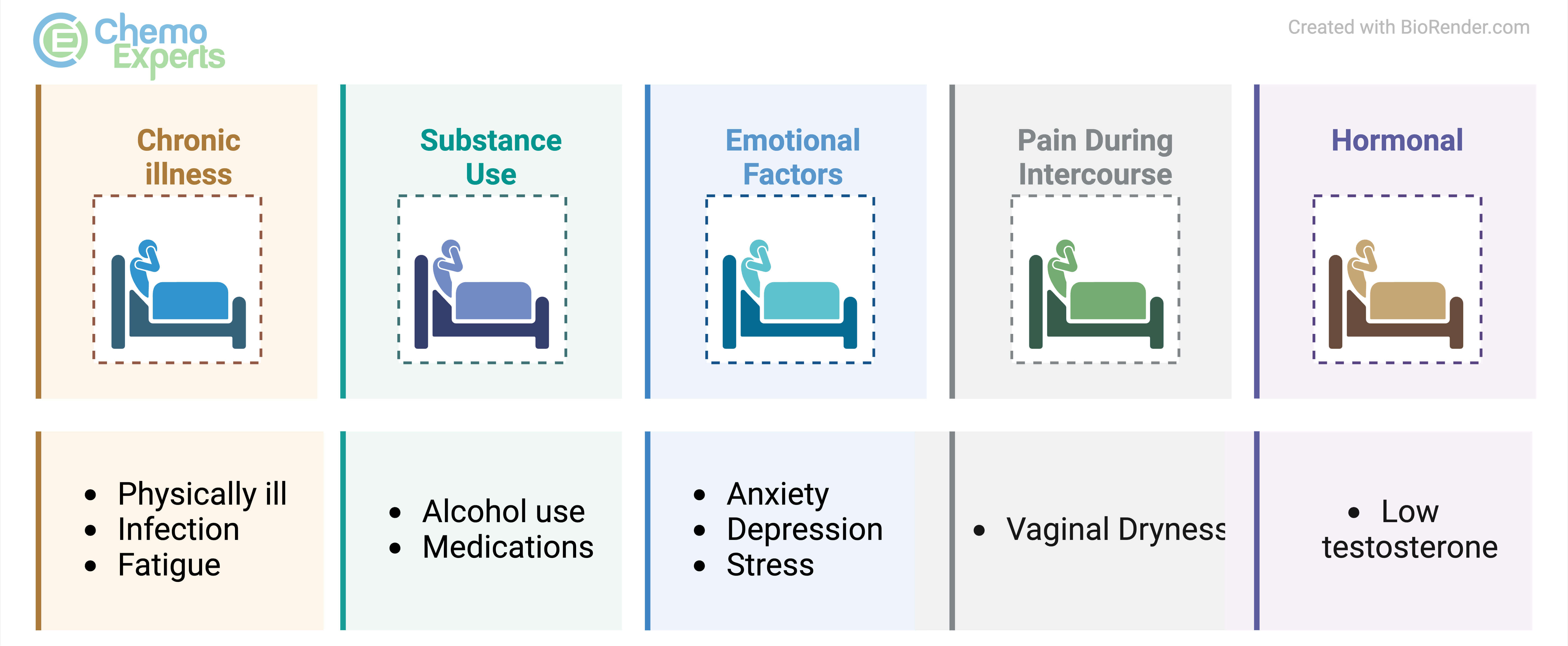 Decreased libido can be caused by a variety of factors, including hormonal imbalances, certain medications (both chemotherapy and supportive care medications), stress, depression, relationship problems, and chronic illnesses such as cancer.