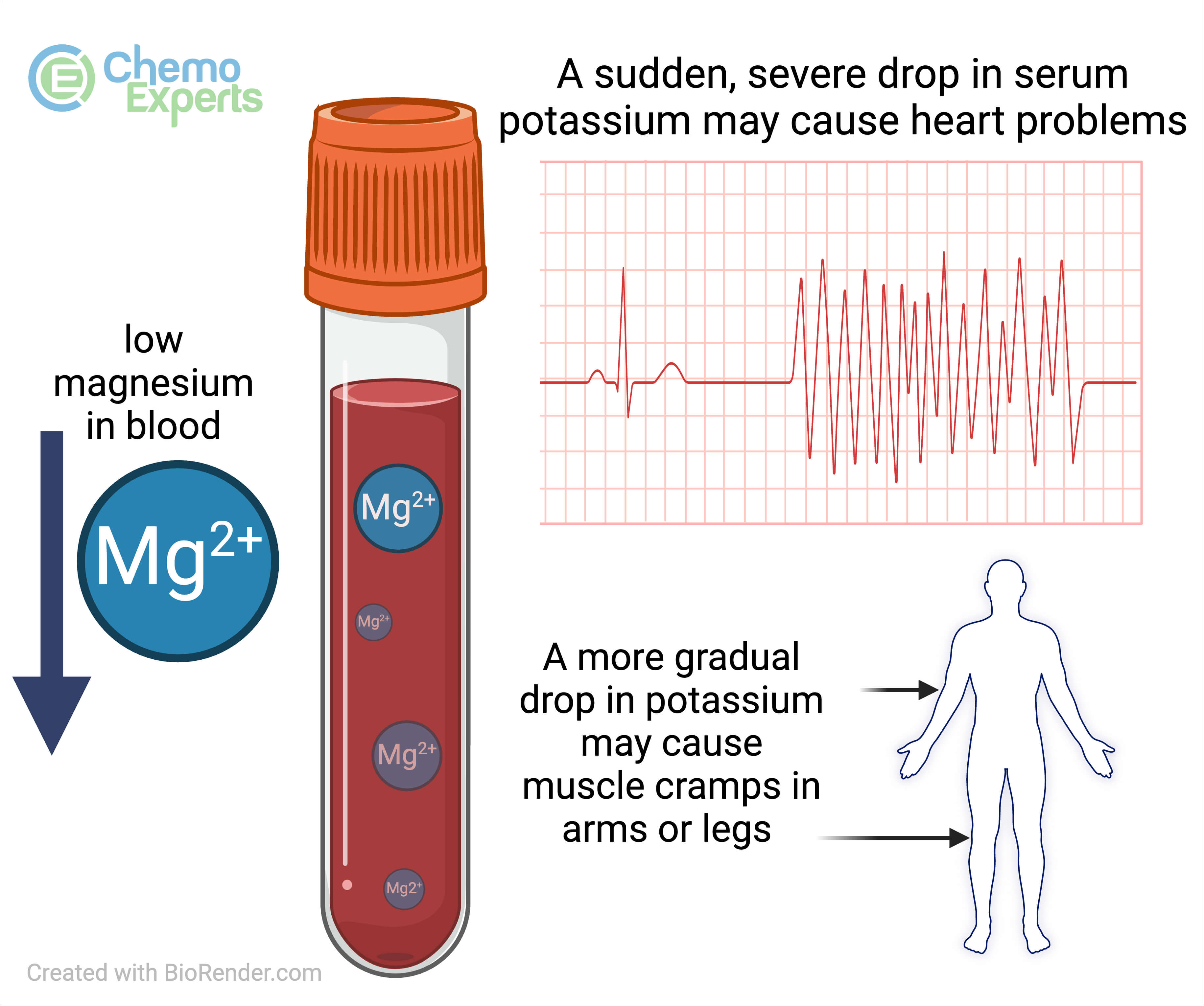 Magnesium is an electrolyte that is important for many bodily functions including energy metabolism, protein synthesis and neuromuscular function. When magnesium levels drop too low, it can cause muscle weakness, changes in mood, seizures, cardiac arrhythmias, and tremors. Low blood potassium, or hypokalemia, can also happen when the blood magnesium is too low.